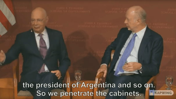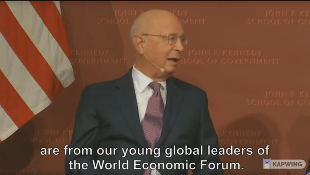 I denna video säger Klaus Schwab att: ”Vi går in i de globala regeringarna med våra unga globala ledare”, som har utbildats vid: