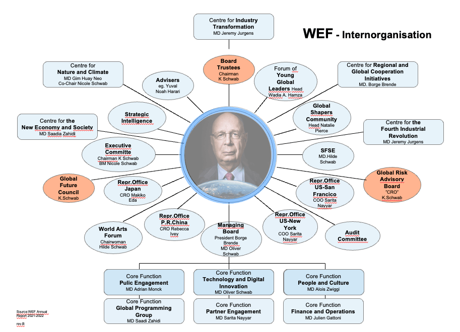 I centrum för WEF:s verksamhet finns grundaren själv, som enväldigt utser medlemmarna i organisationens huvudstyrelse (Board of Trustees). Styrelsen – som består av ”exceptionella individer som agerar som väktare av dess uppdrag och värderingar, och övervakar forumets arbete med att främja sant globalt medborgarskap” – väljs alltså inte i demokratisk ordning. WEF-medarbetaren Ursula von der Leyen kom direkt från WEF:s styrelse till uppdraget som EU-kommissionens ordförande.