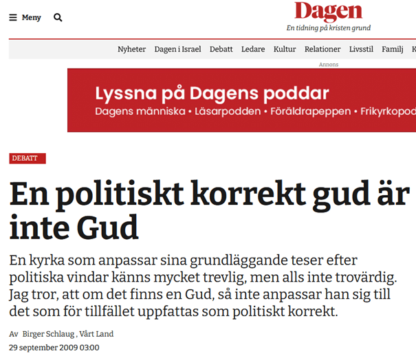 En politiskt korrekt gud är inte Gud, enligt Birger Schlaug. Tänk om han har rätt! Han var – enligt egen utsago – inte bekännande kristen när han skrev sitt debattinlägg 2009. Är han mer klarsynt än de som anses vara ledare för Guds församling?