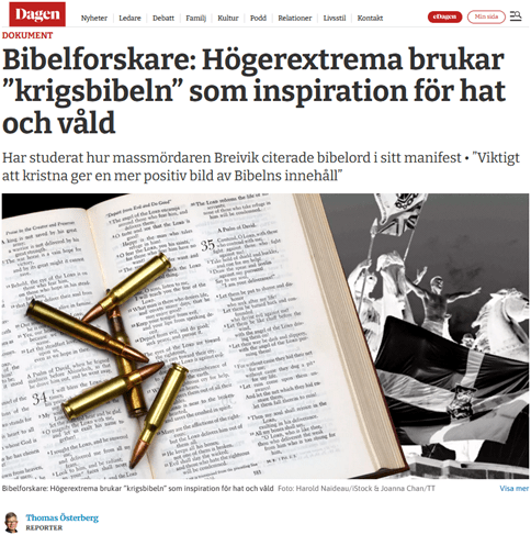 ”Lösryckta bibelcitat om krig och våld används i högerextrem retorik – och var en del av den norska massmördaren Anders Behring Breiviks manifest. Bibelforskaren Hannah Strømmen beskriver att extremister använder sig av ”krigsbibeln”.