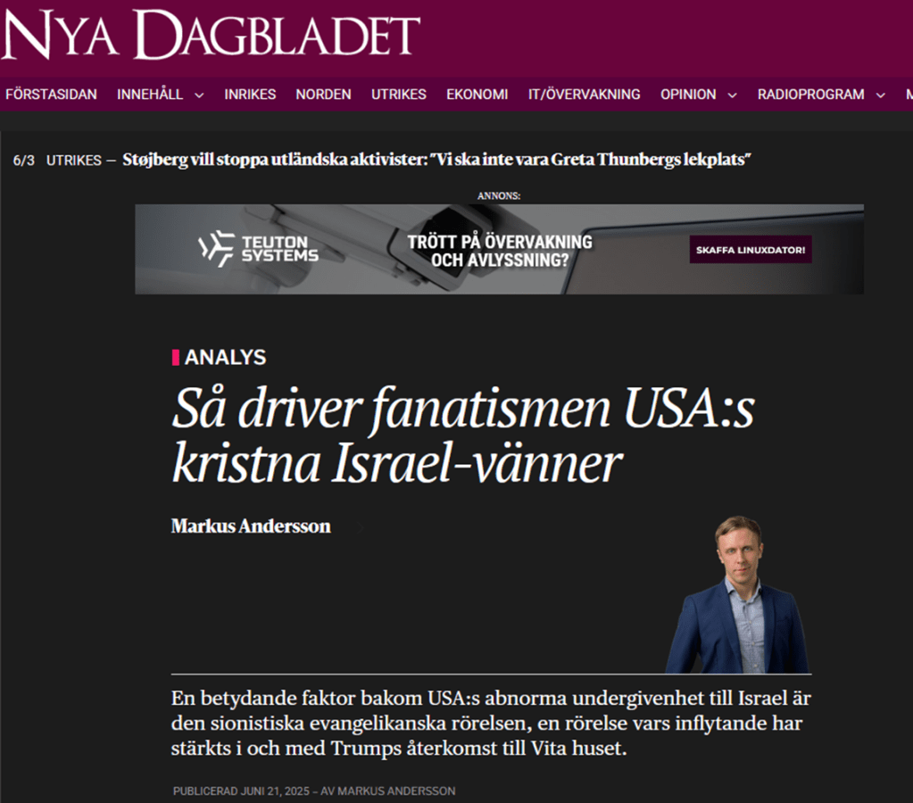 - https://nyadagbladet.se/analys/sa-driver-fanatismen-usas-kristna-israel-vanner/ ↩︎