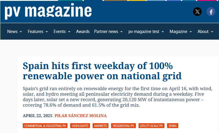 - https://www.pv-magazine.com/2025/04/22/spain-hits-first-weekday-of-100-renewable-power-on-national-grid/ ↩︎