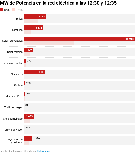 Tre minuter före strömavbrottet, stod solenergiproduktionen för 65 % av den totala effekten, en ovanligt hög siffra. Mellan den tidpunkten och klockan 12:35 kopplades inte mindre än 10,2 GW solkraft, 3,87 GW kärnkraft och 1,357 GW vindkraft bort.7