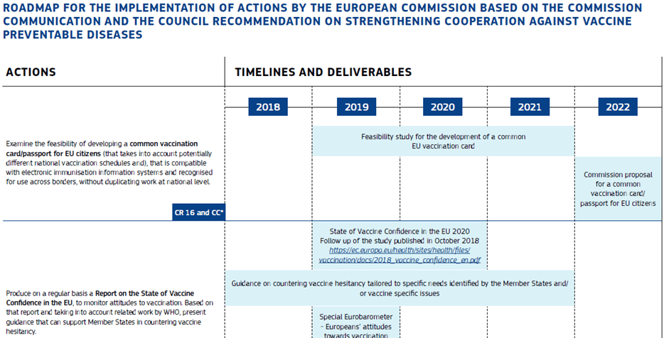 I planen ingår att regelbundet följa upp medborgarnas inställning till vaccination, och hjälpa medlemsstaterna att motverka vaccintveksamhet. År 2022 skall EU-kommisionen lägga fram ett förslag till gemensamt vaccinationskort/pass för EU-medborgare, men den praktiska tillämpningen har börjat redan sommaren 2021.