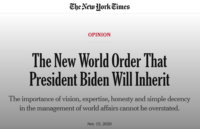 I november 2020, skriver New York Times om den nya världsordning som WEF-medarbetaren, president Joe Biden kommer att ärva.