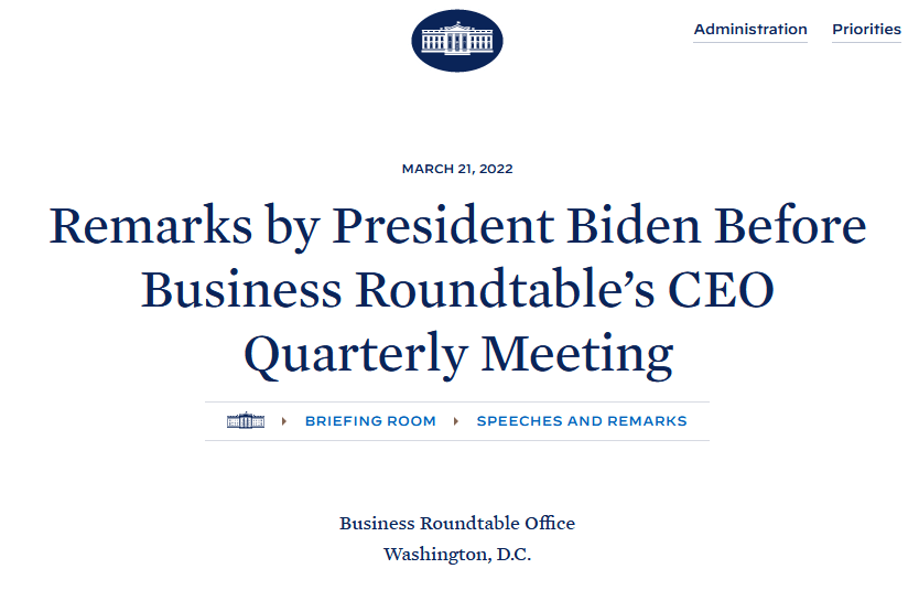 Vid Business Roundtables kvartalsmöte i mars 2022, sade Joe Biden att: ”… det kommer att finnas en ny världsordning där ute, och vi måste leda den. Och vi måste förena resten av den fria världen i att göra det.”